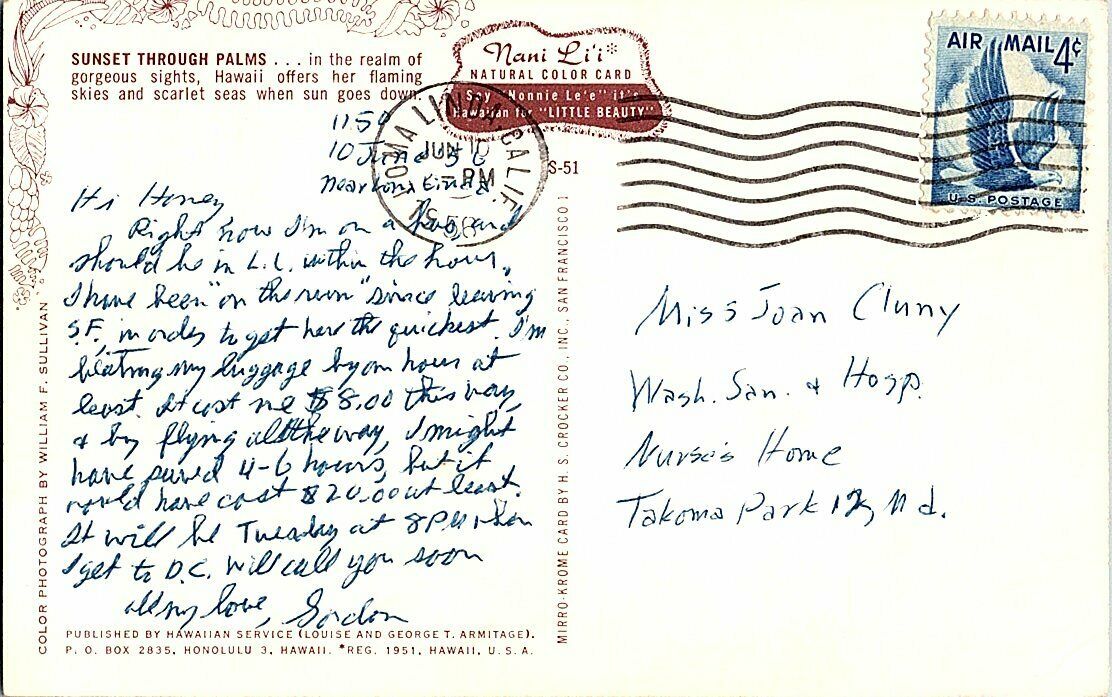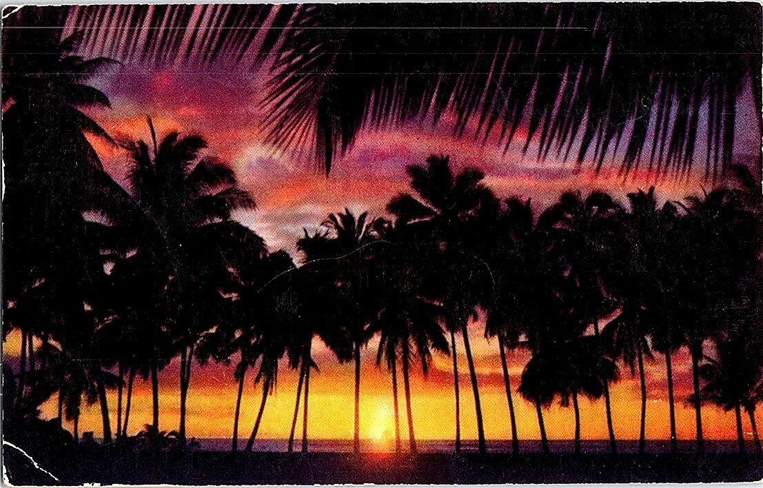 Sunset Through Palms Hawaii Vintage Postcard Standard View CardPostmarked 1956Reasonable Offers Always ConsideredPostcard Enclosed in Clear SleevePlaced Between 2 Pieces of CardboardShipped USPS First Class MailNon Machinable-Marked Do Not BendCombined Shipping AvailableQuestions WelcomedVisit my store Darrel's Vintage Deals