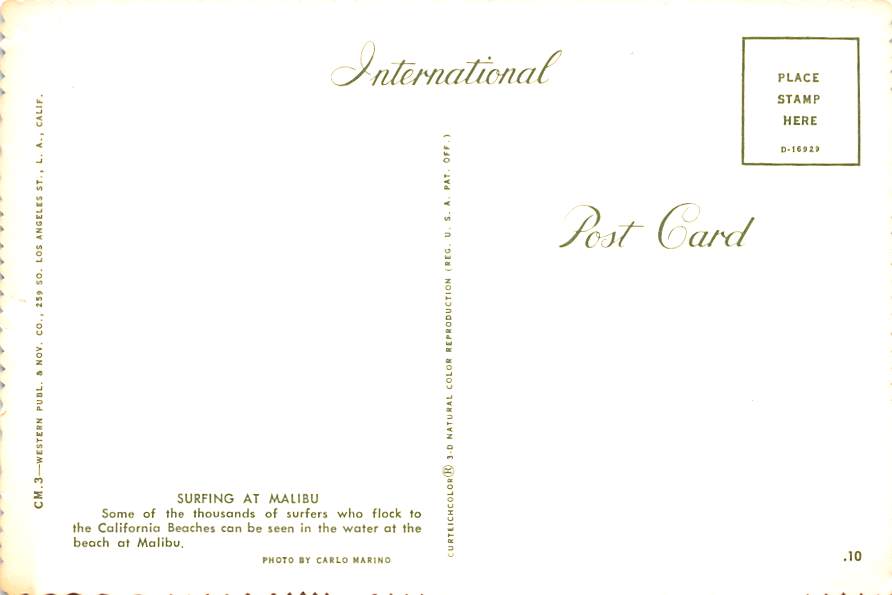 Surfing - California Grade: 1 Category: Continental Size Postcard, Approx 4 in x 6 in (10 cm x 15.25 cm) Product Size: Continental size: 4X6 inches (10.5 cm x 15 cm) Grading Scale: Grade 1 = Perfect corners Gra ... Read More