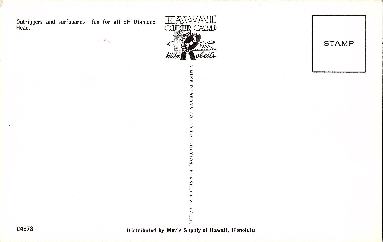 Experience the vibrant surf culture of Hawaii with this vintage photochrome postcard featuring outriggers and surfboards off Diamond Head. Captured in stunning color lithograph printing, this postcard highlights a dynamic scene of surfers riding the waves against the iconic volcanic crater backdrop. The bright blue skies and sparkling ocean vividly convey the excitement and fun of Hawaiian beach life during the 1960s.Produced by Mike Roberts Color Card and distributed by Movie Supply of Hawaii, Honolulu, this postcard is a licensed reprint from the photochrome era, circa 1960-1969. Its standard 5.5 x 3.5 inch size makes it perfect for collectors of Hawaiian and surfing memorabilia. The card's depiction of traditional outrigger canoes and surfing activity offers a nostalgic glimpse into one of the United States' most beloved island regions, making it a unique collectible for those interested in vintage postcards, Hawaii travel, and beach culture.