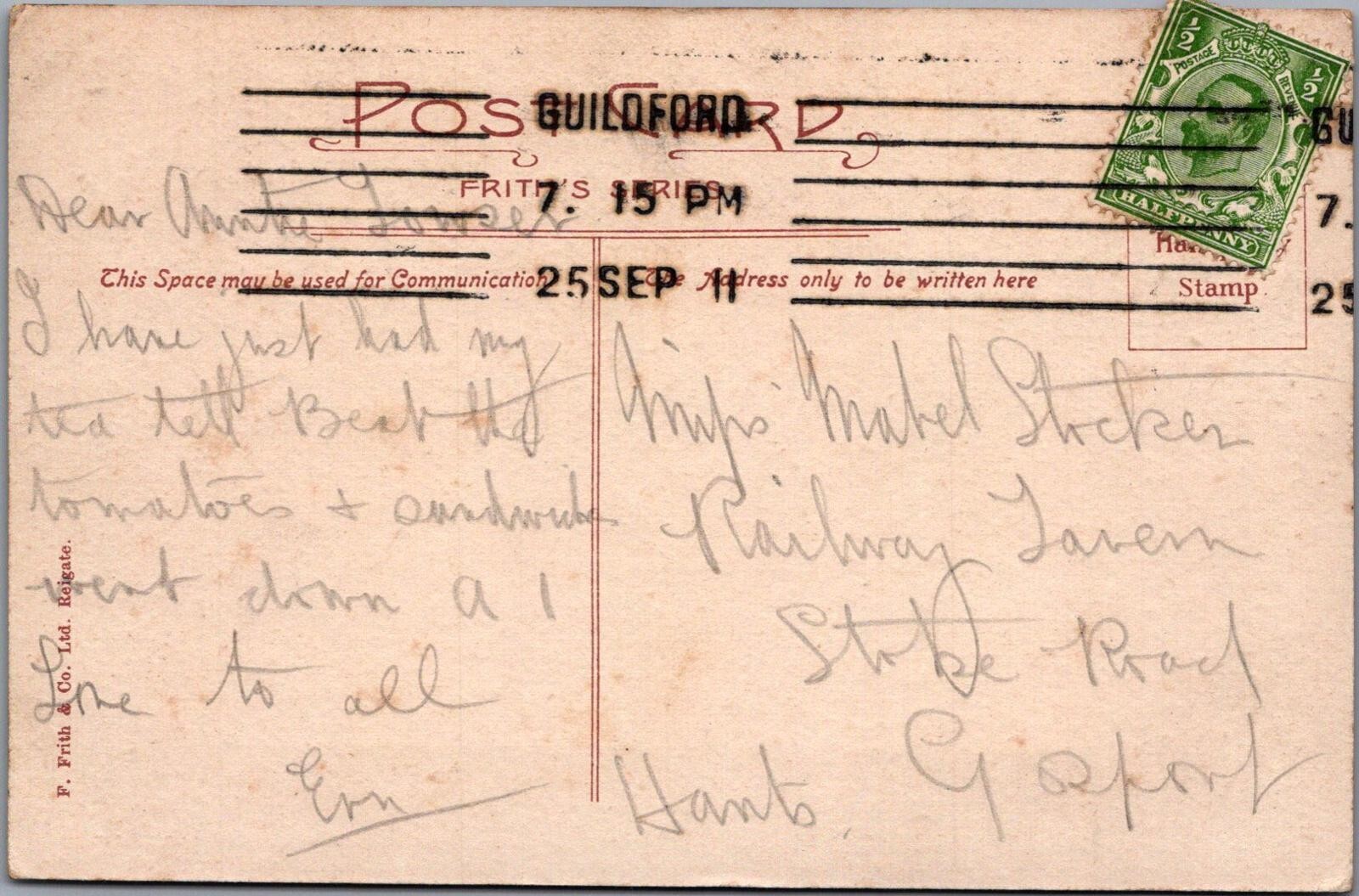 Surrey Postcard - Greetings From Guildford XT234Publisher: Frith Postcard size: Standard. Posted in 1911Postcard defect(s): Please also use the image magnifier to make your own assessment on the condition. Please ignore any lines caused by the scanner.When possible all of our postcards will be posted to you inside a collectable plastic postcard sleeve and a board backed envelope which will be marked 'Please do not bend'.Any 'Mo's Postcards' watermark does not appear on the actual postcard'.