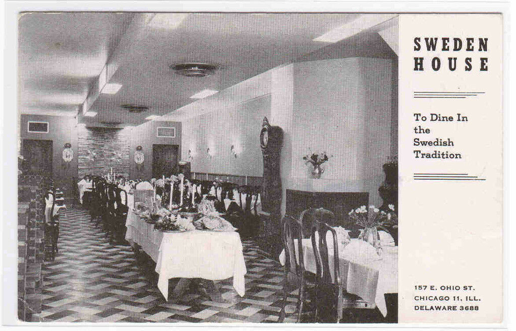 Description: Sweden House Restaurant Interior Chicago IL postcard Type: b&w printed. Circa 1950s Condition: excellent, light corner wear Any hatched effect on pic is scanner effect, not on postcard. Postal use: unus ... Read More