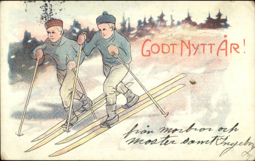 Swedish New Year - Boys Skiing c1905 Postcard