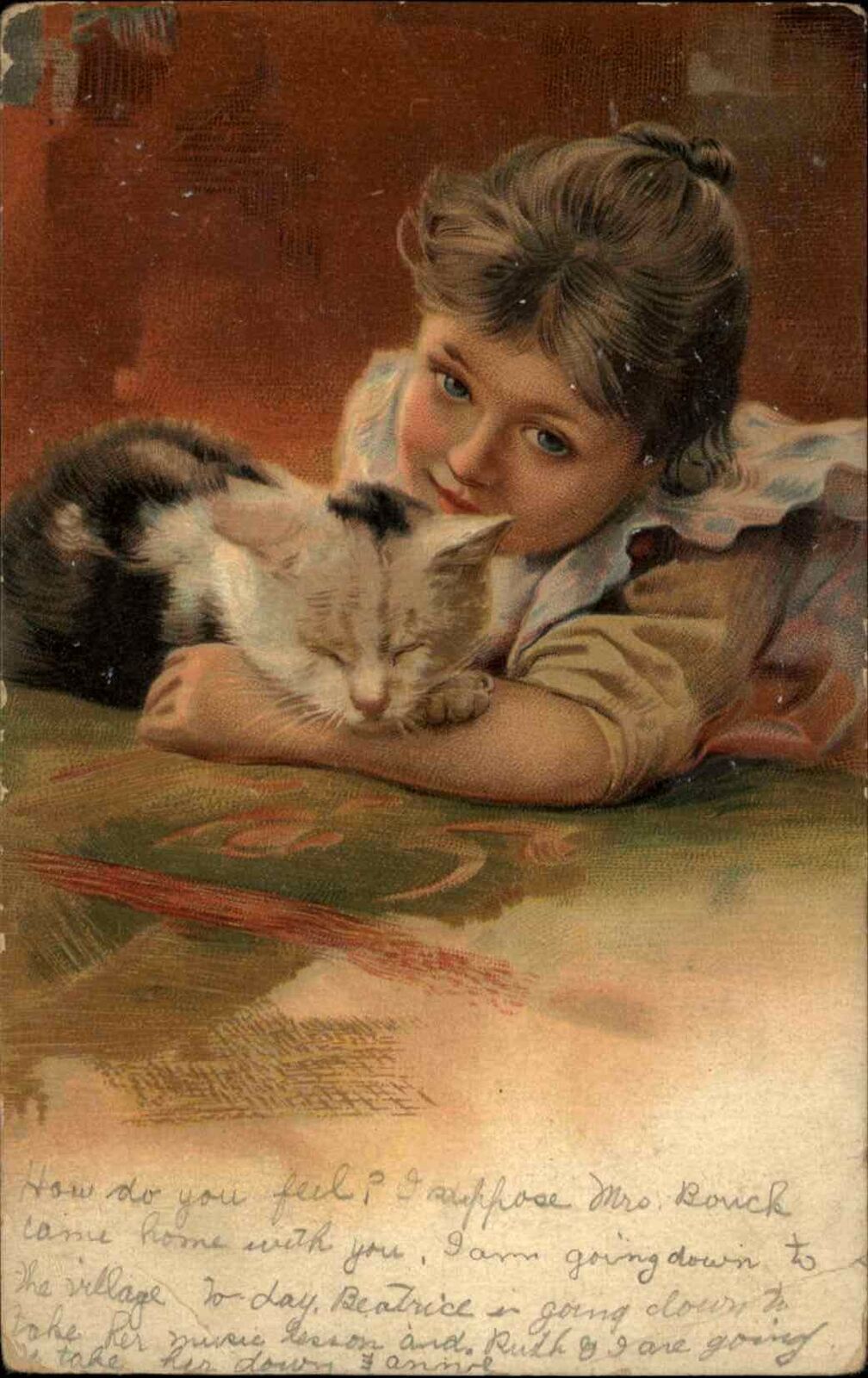 Sweet Little Girl & Her Sleeping Cat Kitten c1905 Postcard