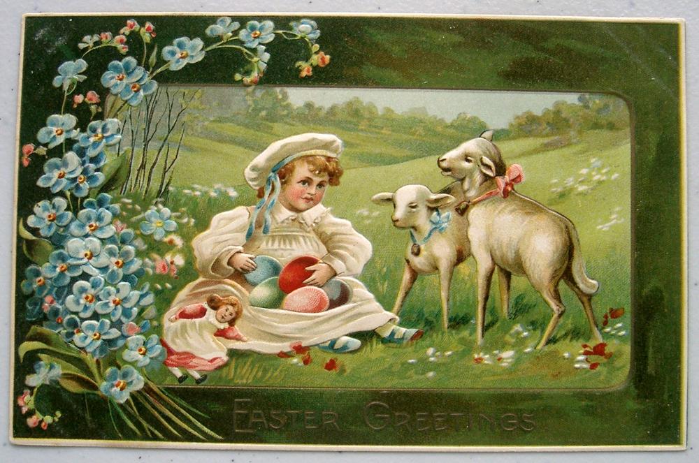 Sweet Little Girl Lambs Doll Easter Embossed Postcard