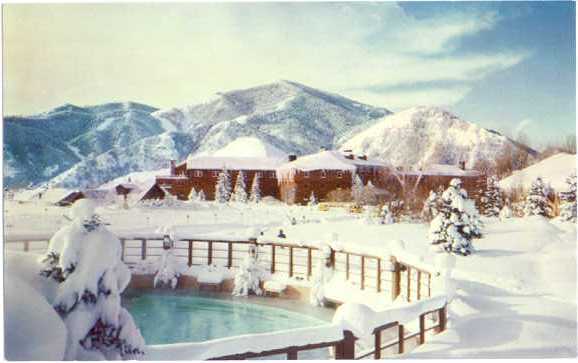 Swimming Pool and Lodge in Winter, Sun Valley, Idaho, ID, pre-zip code Chrome