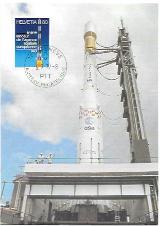 Nice card dated 1979, Showing Rocket Launch. Postmark is Geneva, Switzerland.
