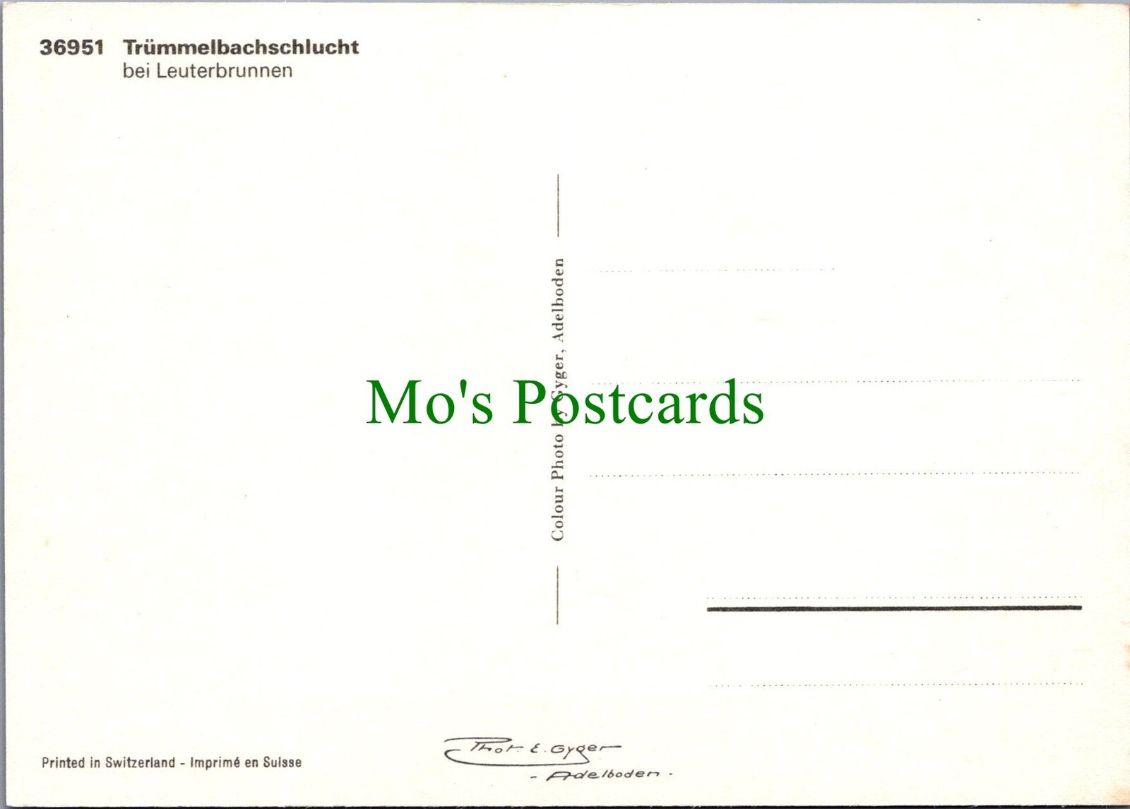 Trummelbachschlucht, Switzerland. This is a fantastic continental sized postcard which would be a great addition to your postcard collection. This postcard has slight rear surface paper residue. If a postcard has any obvious defects they will be mentioned within this product description. Please use our image magnifier to make your own assessment on the condition. All of our postcards are posted to you inside a plastic sleeve and a board backed envelope which will be marked 'Please do not bend'. The 'Mo's Postcards' watermark does not appear on the actual postcard'. Mo's Ref No: SW8021 for Trummelbachschlucht, Switzerland