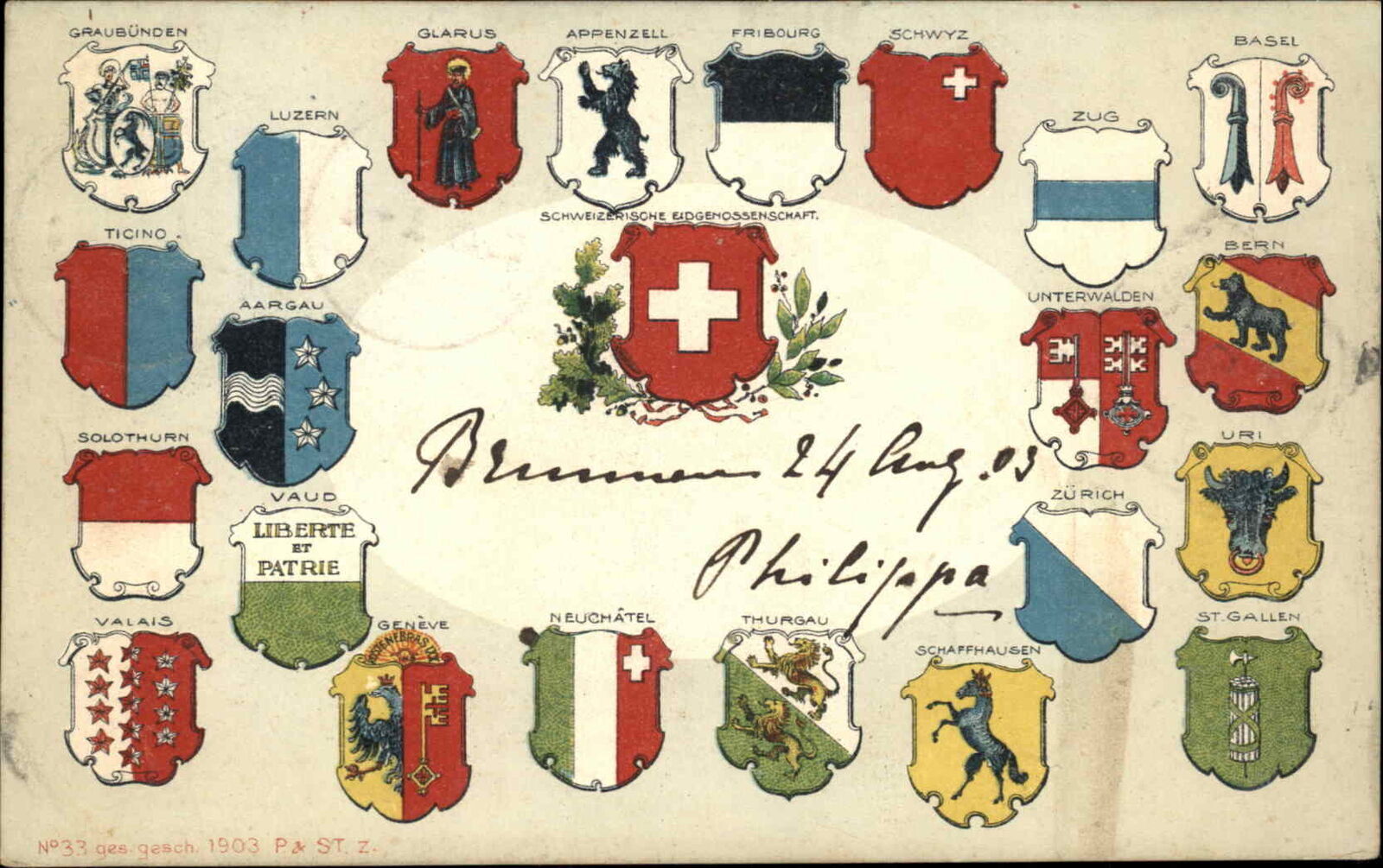 Switzerland Swiss Suisse Heraldic Cantons Crests Shields c1910 PC