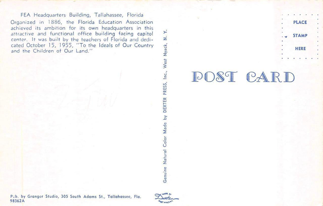 c1960's Chrome postcard. TALLAHASSEE, FL Florida FEA HEADQUARTERS BUILDING~Education Association Postcard TALLAHASSEE, FL Florida FEA HEADQUARTERS BUILDING~Education Association Postcard Click images to enlarge Description c1960's Chrome postcard. Please note that if in the image of the postcard back, an odd colored shadow appears on one side, it is a scanner defect and it does not appear on the card. Item is described as accurately as possible. Please View My Other Items For Sale and be sure to Add me to your Favorite Sellers. Please be sure to Visit My Hip Store, new items are listed every week. Please don't hesitate to send me a question, before or after your purchase. I want to make sure your experience is a positive one, and will respond promptly to all inquiries. I only sell standard size vintage postcards, shipped typically within 24 hours, in a cardboard stiffened envelope. I offer a full refund if you are unhappy with your purchase, so please buy with confidence. Pictures sell!Auctiva offers Free Image Hosting and Editing.300+ Listing Templates!Auctiva gets you noticed!The complete Hip Selling Solution.Track Page Views WithAuctiva's FREE Counter