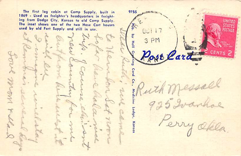 Teamster'S Cabin Fire House Fort Supply OK Grade: 1 Size: Regular Size Postcard - approximately 3 1/2 inch x 5 1/2 inch (9 CM x 14 CM) Grading Scale: Grade 1 = Perfect corners Grade 2 = Very Minimal corner wear ... Read More
