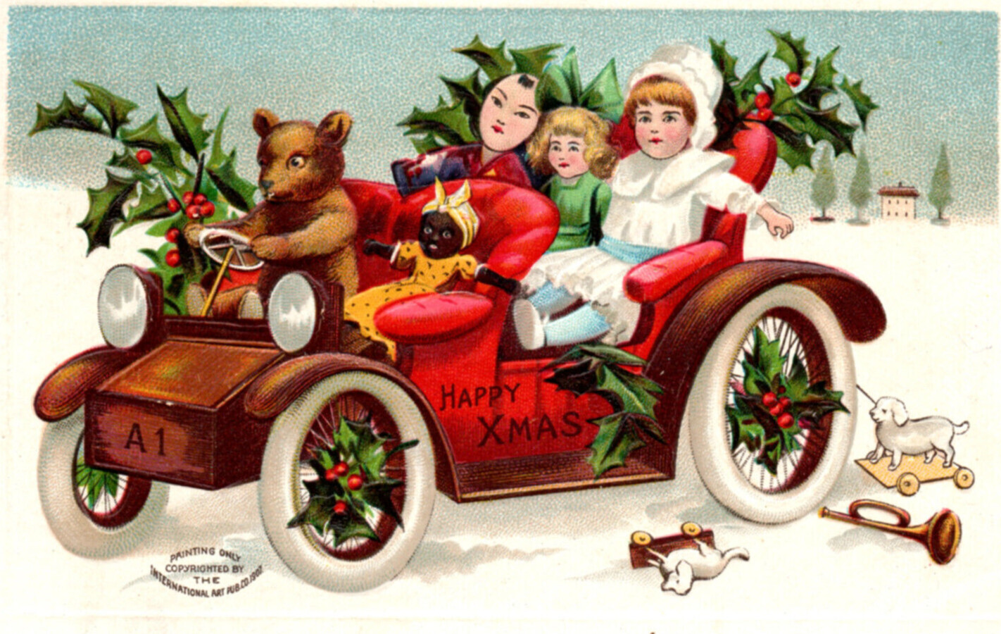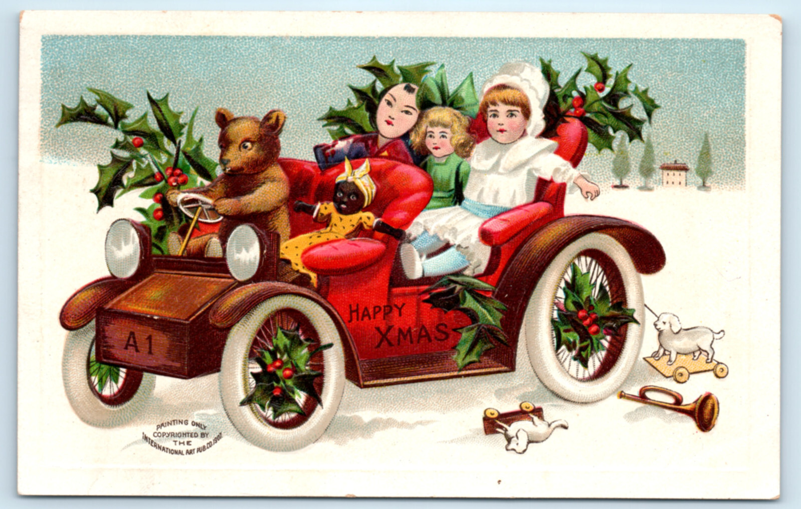Teddy Bear Automobile Motorcar Christmas Postcard