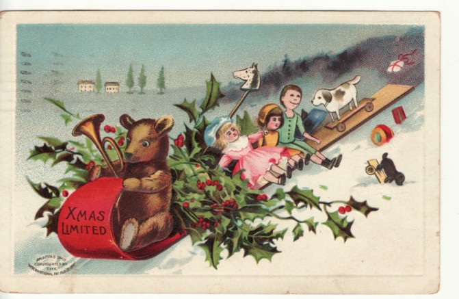 TEDDY BEAR drives CHRISTMAS SLED / DOLLS IAP postcard