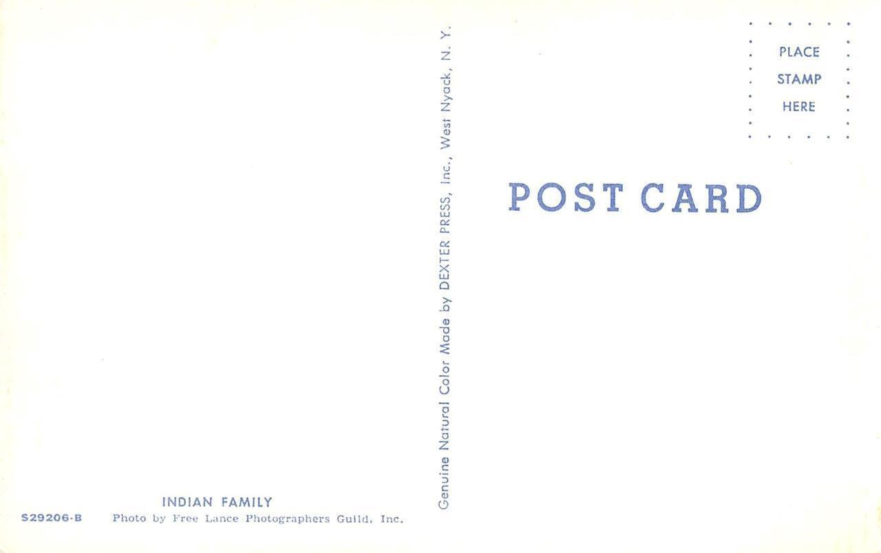 Very Good. Vintage Postcard. Teepee Native Americans INDIAN FAMILY Dexter Press 1950s Chrome Vintage Postcard Teepee Native Americans INDIAN FAMILY Dexter Press 1950s Chrome Vintage Postcard Click images to enlarge Description Vintage Postcard. There is a flat rate of $1.00 to ship anywhere within the U. S. Multiple items will have a combined shipping rate of only $1.00. International - $1.50. Please check our other items in our Hip store: Visit My Hip Store. Please feel free to contact me with any questions you may have. All cards sold are vintage, no reproductions. Images sell!Get Supersized Images & Free Image HostingCreate your brand with Auctiva'sCustomizable Templates.Attention Sellers - Get TemplatesImage Hosting, Scheduling at Auctiva.com.Track Page Views WithAuctiva's Counter