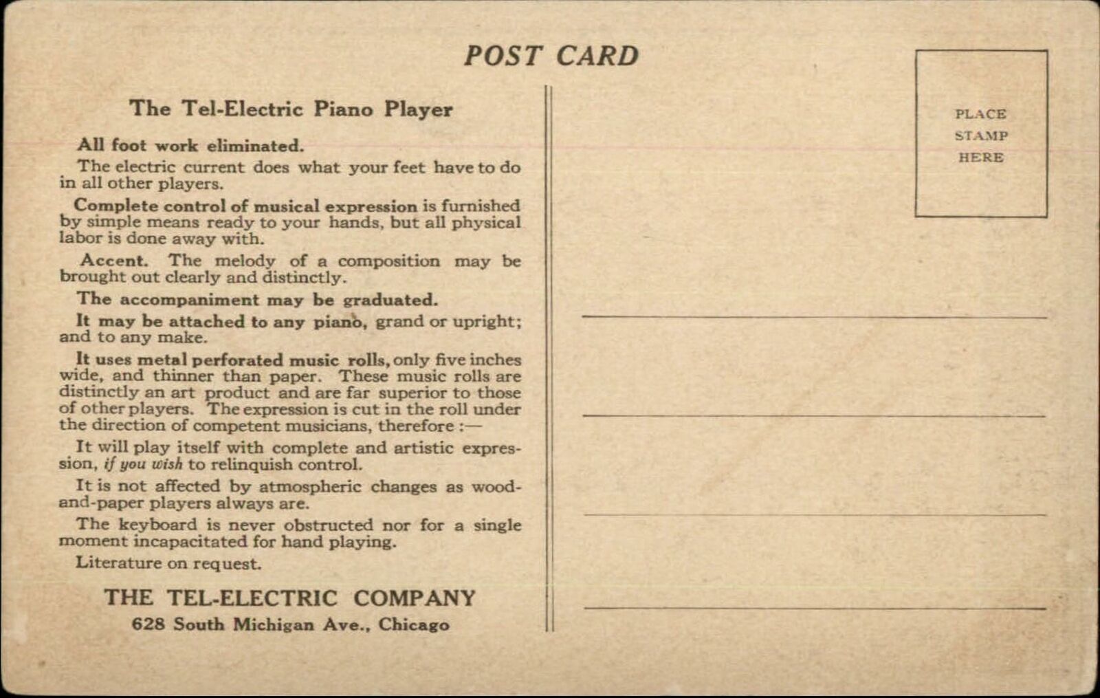 Tel-Electric Piano Player Chicago IL Company c1910 Postcard