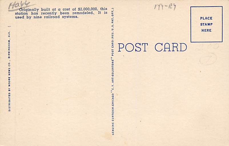 Terminal Station Birmingman, Alabama Postcard - View Images Grade: 1 Size: R - Regular Size Postcard - approximately 3 1/2 inch x 5 1/2 inch (9 CM x 14 CM) Grading Scale: Grade 1 = Perfect corners Grade 2 = Ver ... Read More