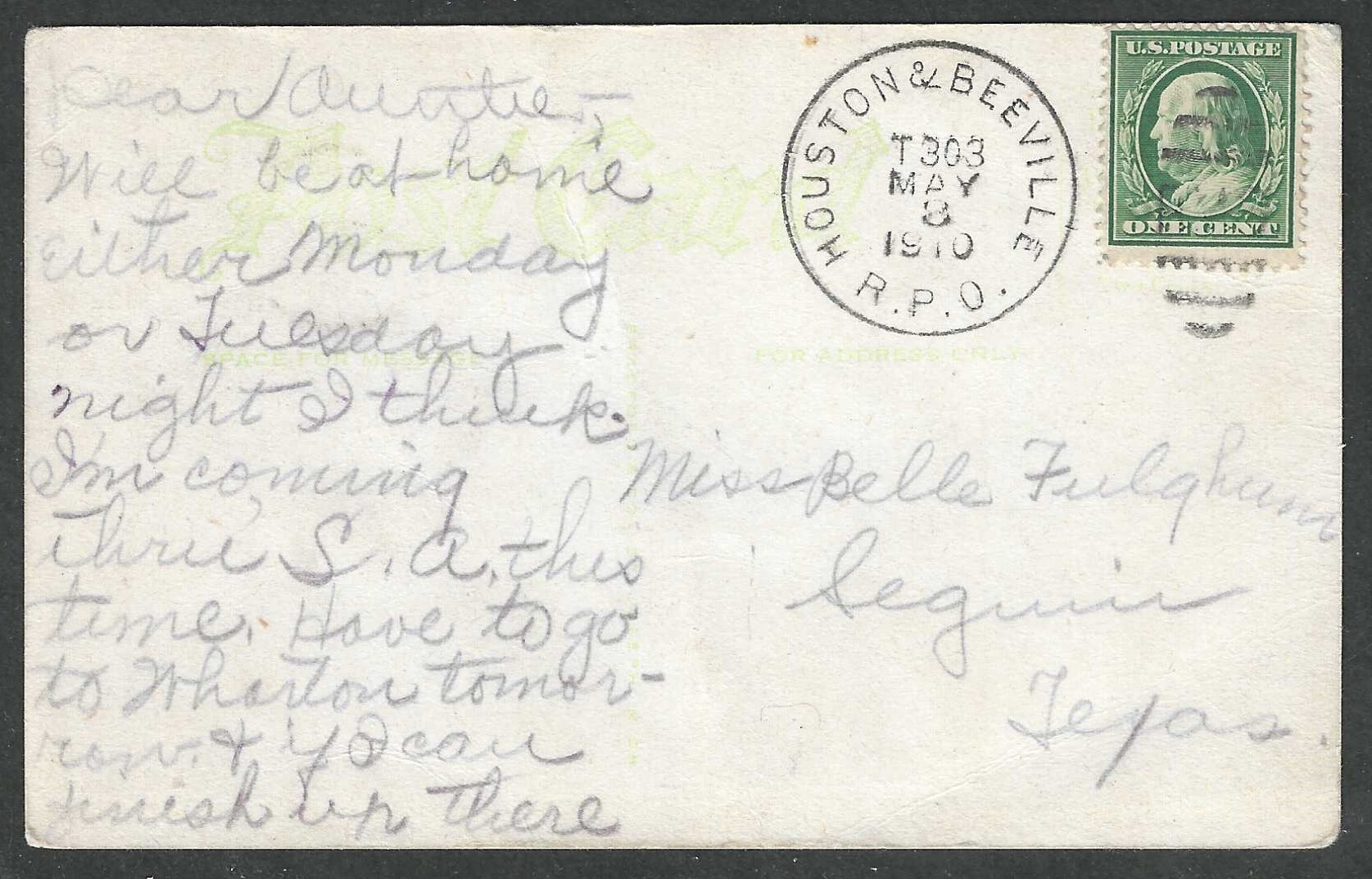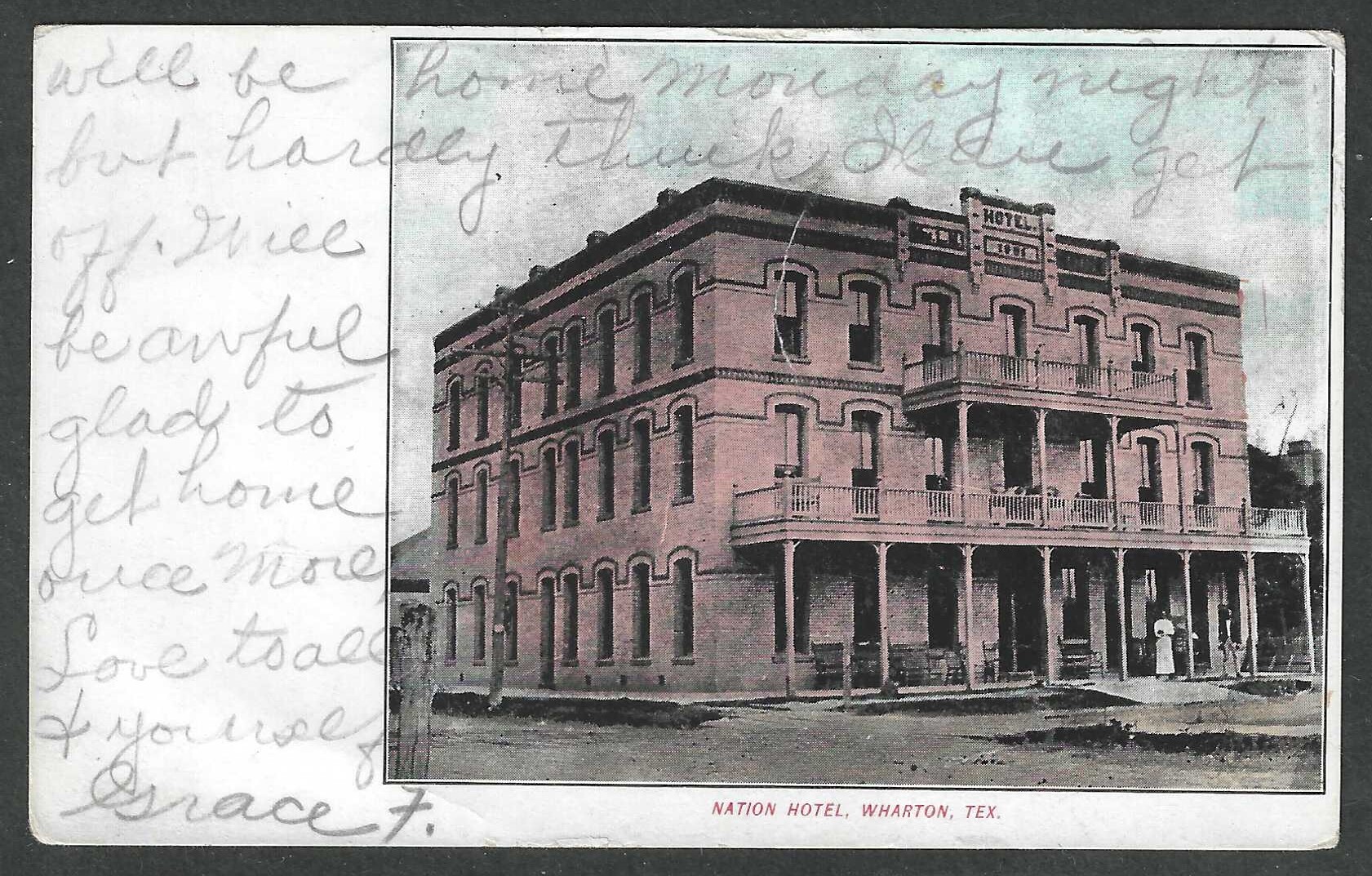 Nation Hotel, Wharton, Tex.Posted: May 8, 1910 on the "Houston & Beeville, R.P.O."