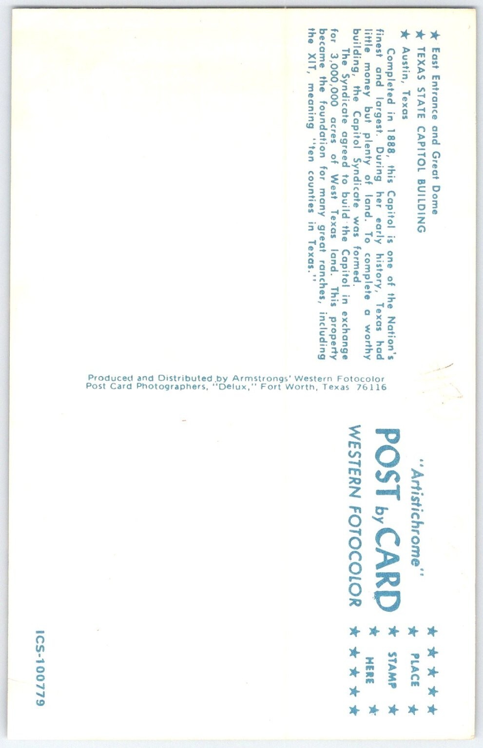 This vintage linen postcard features a vibrant color image of the iconic Texas State Capitol Building in Austin, showcasing the impressive dome and surrounding gardens in full bloom. The postcard captures the architectural grandeur and historical significance of one of the nation's finest capitol buildings, completed in 1888. The lush greenery and colorful flowers in the foreground add a picturesque charm, making it a perfect collectible for enthusiasts of Texas history and architecture.Produced and distributed by Armstrongs' Western Fotocolor, this postcard is printed using the "Artisticchrome" process, known for its rich color saturation and fine detail. The back of the card provides interesting historical context about the capitol's construction, including its financing through the sale of West Texas land. This 5.5 x 3.5 inch standard size postcard remains a great addition for collectors interested in vintage American landmarks or Texas memorabilia.