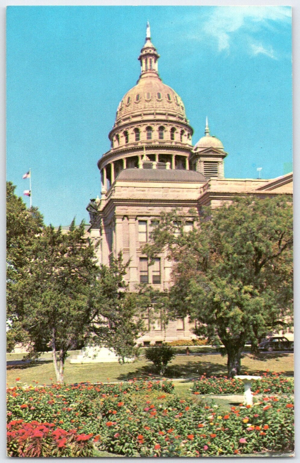 This vintage linen postcard features a vibrant color image of the iconic Texas State Capitol Building in Austin, showcasing the impressive dome and surrounding gardens in full bloom. The postcard captures the archit ... Read More