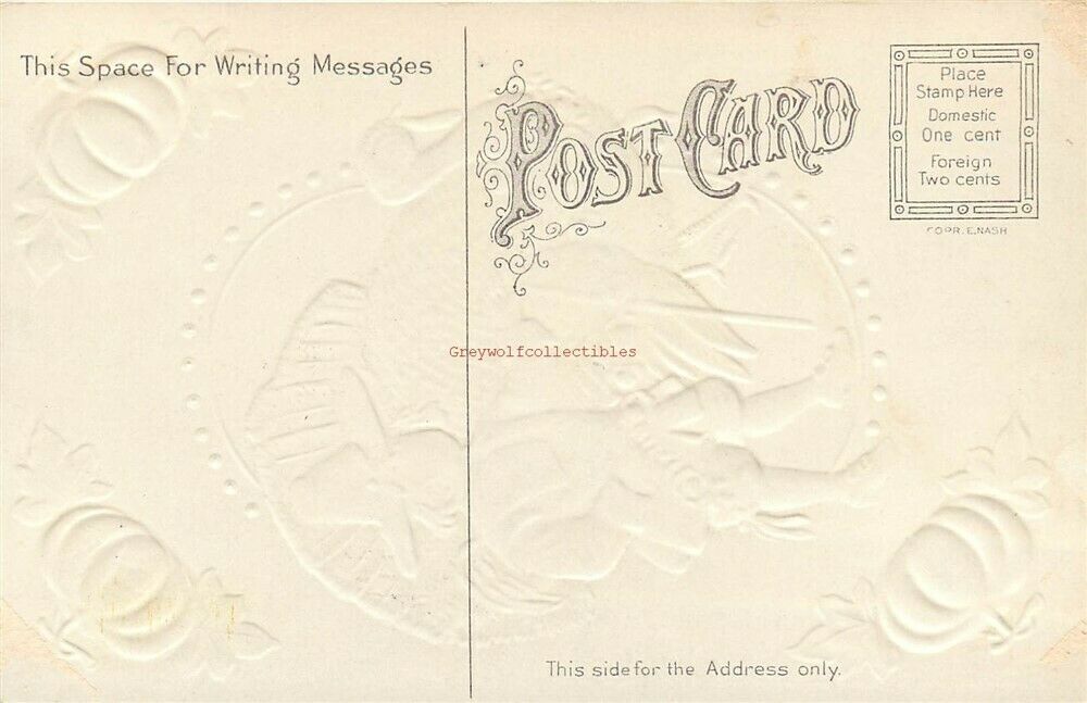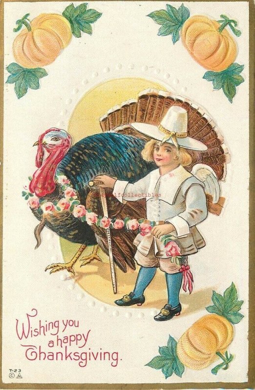 Early Printed Postcard Thanksgiving, Boy with turkey on flower leash, Pumpkins, Embossed Postmark: None Image: Nice and clean Corners: Light wear Faults/Other: