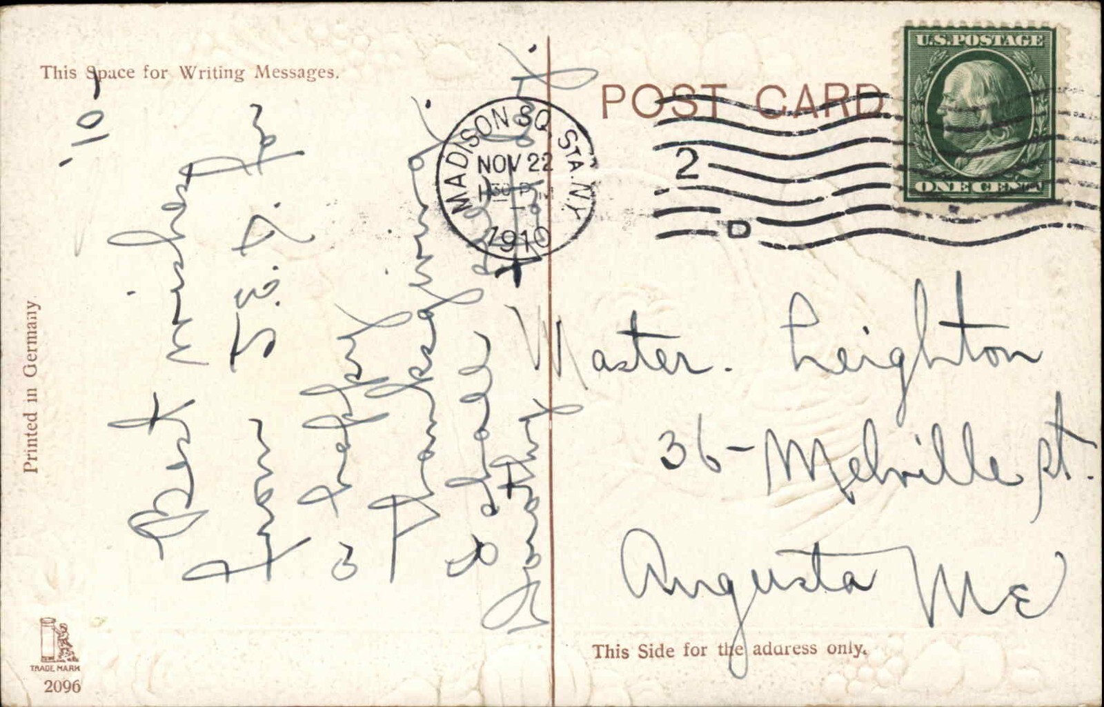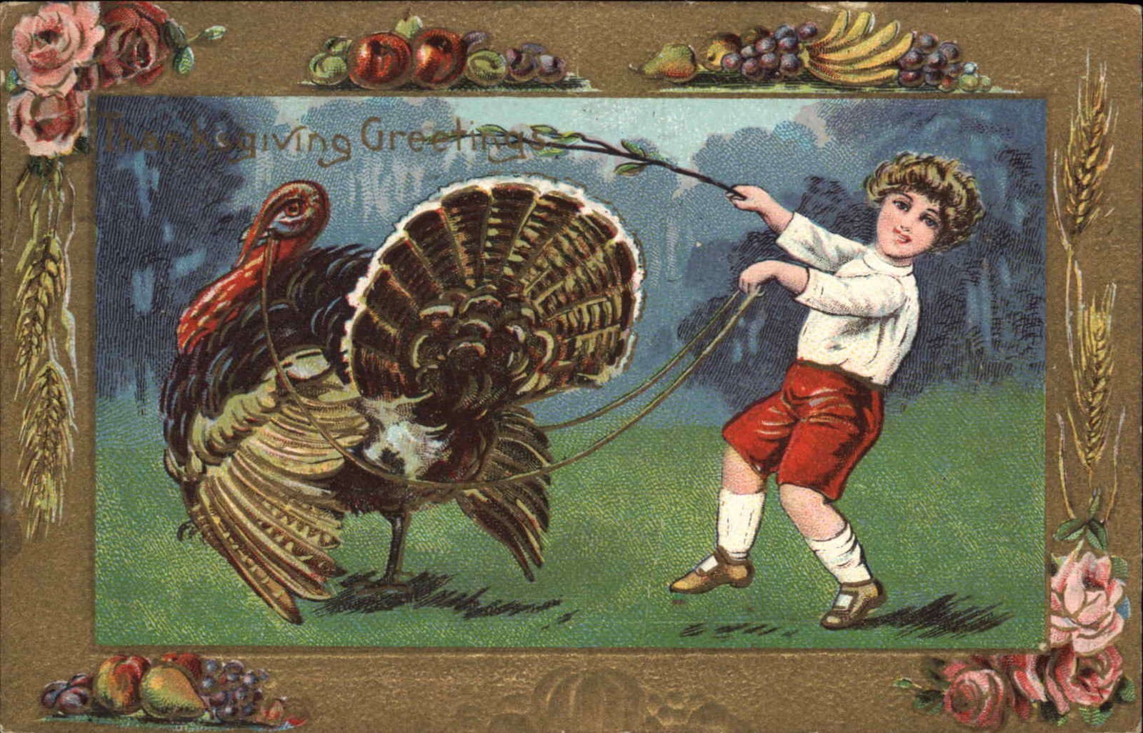 Thanksgiving Children Turkey Flower Gilt Embossed Vintage Postcard