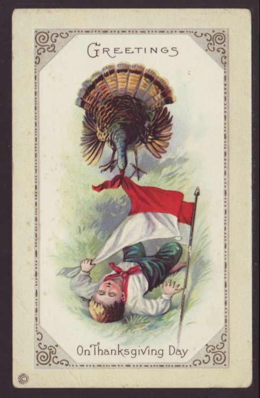 Thanksgiving Day Greetings,Turkey,Boy With Flag Postcard