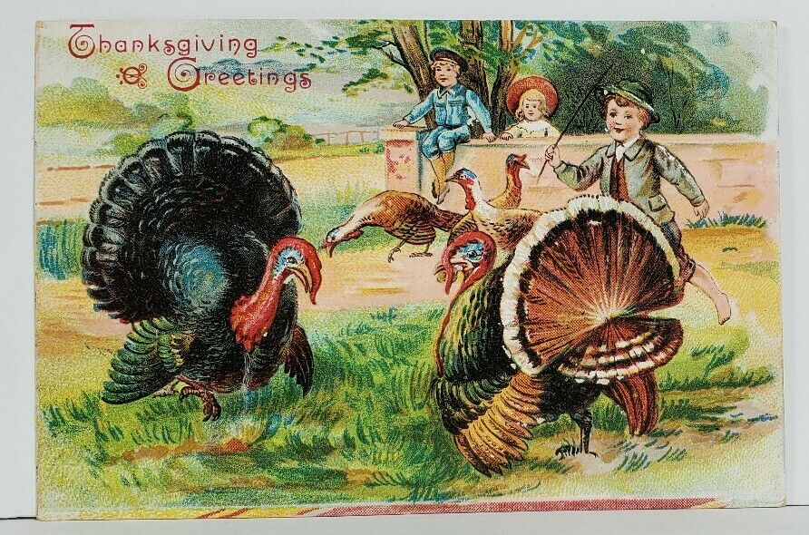 Thanksgiving Greetings Children Chasing Turkeys Embossed Postcard M20