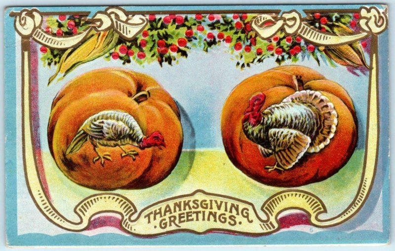 THANKSGIVING GREETINGS Embossed PUMPKINS & TURKEYS ca 1910s Postcard