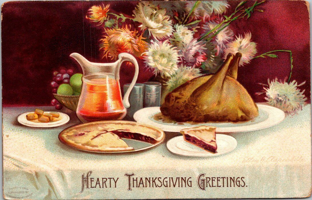 Thanksgiving Greetings Turkey and Pie 1907 Clapsaddle 1907