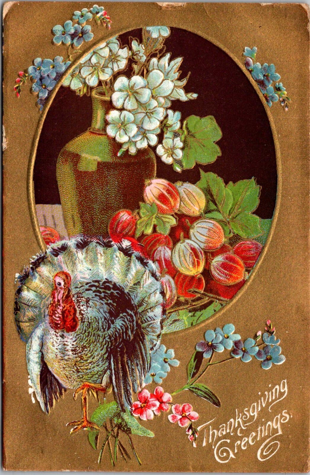 Thanksgiving Greetings, Turkey, Gooseberries c1910 Vintage Postcard Y34