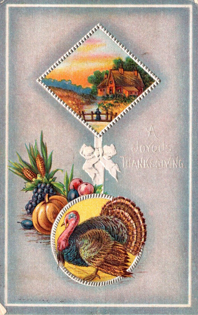 Thanksgiving Greetings With Turkey and Landscape Scene 1910