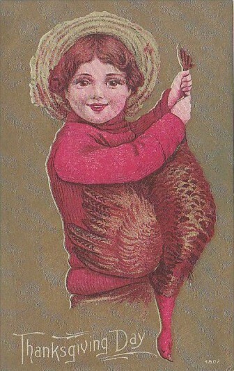 Thanksgiving Young Boy Standing On Pumpkin Watching Turkey