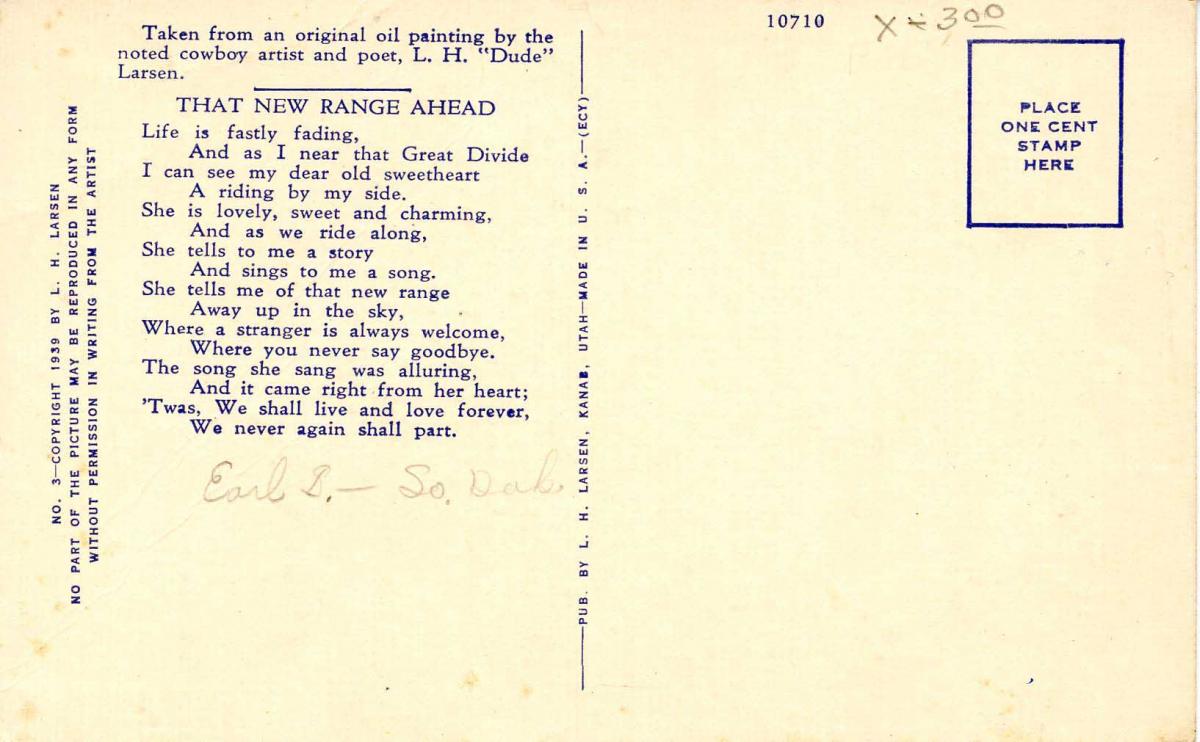 That New Range Ahead - Artist: L.H. (Dude) Larsen Grading of Postcards MINT (M): Perfect condition, no apparent blemishes, flaws, postally unused, may have some writing on back. NEAR MINT (NM): Like new, image is ... Read More