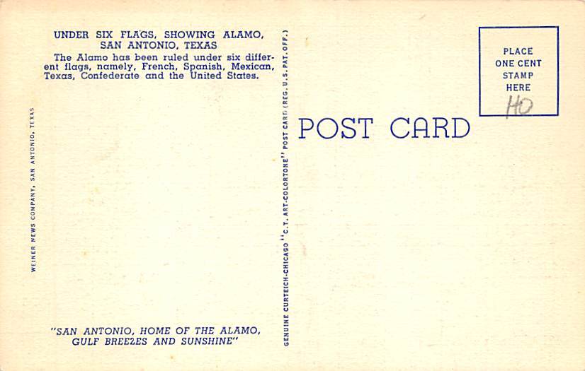 The Alamo Under Six Flags - San Antonio, Texas TX Postal Date: View Images Grade: 2 Size: Regular Size Postcard - approximately 3 1/2 inch x 5 1/2 inch (9 CM x 14 CM) Grading Scale: Grade 1 = Perfect corners ... Read More