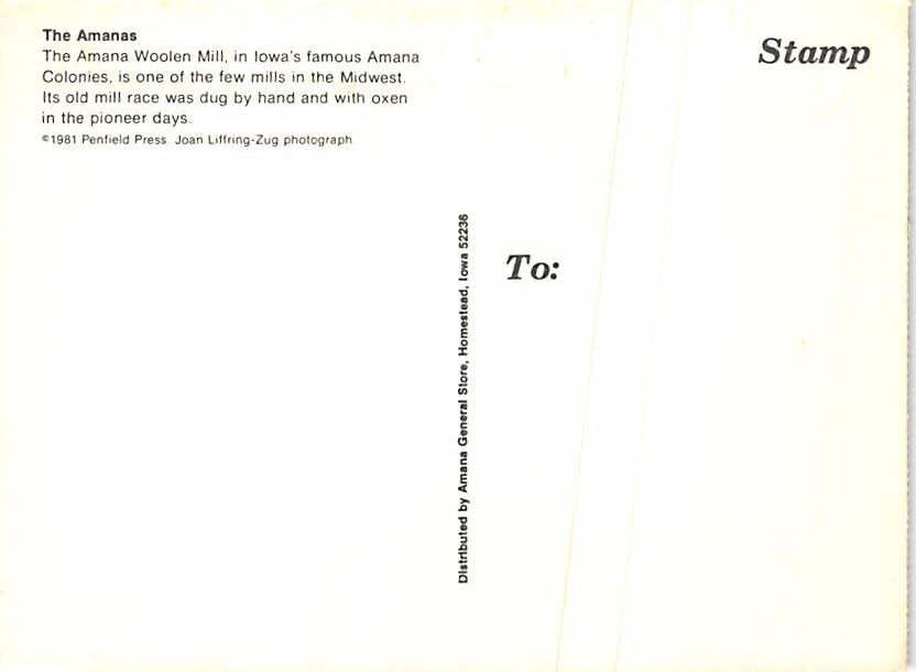 The Amanas, Amanas Colonies Postcard Grade: 1 Size: Continental Size - approximatly 4 Inch x 6 Inch (15 cm x 10.5) Grading Scale: Grade 1 = Perfect corners Grade 2 = Very Minimal corner wear, no creases Grade ... Read More