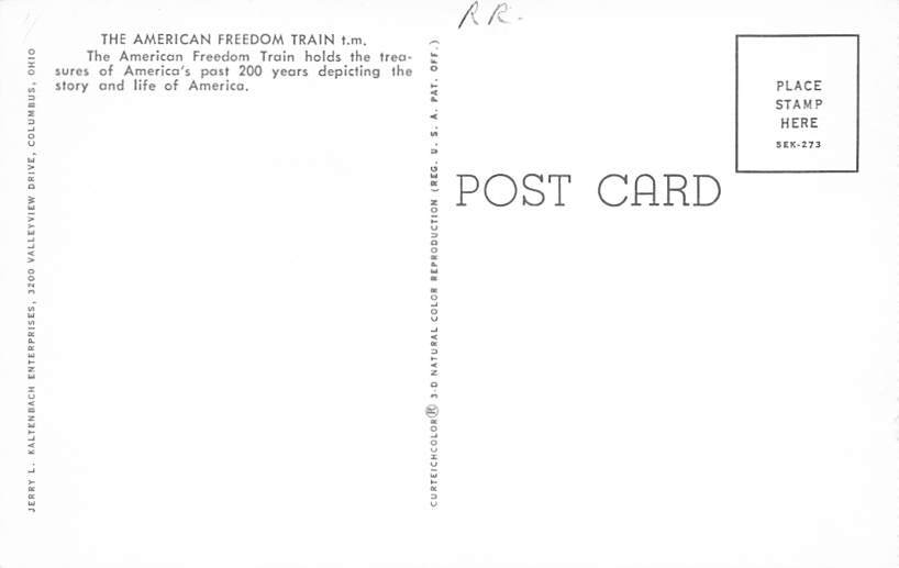 The American Freedom Train Religious Postcard Unused, Grade: 1, , Size: Regular size: Approx 3 1/2 X 5 1/2 inch (9 cm X 14 cm) Grading Scale: Grade 1 = Perfect corners Grade 2 = Very Minimal corner wear, no cr ... Read More
