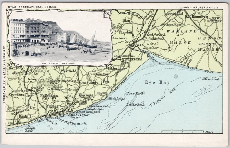 The Beach Hastings England Map Bartholomew John Walker Postcard H80
