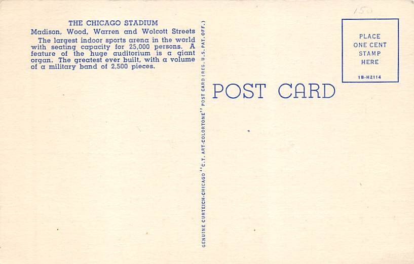 The Chicago Stadium Chicago, Illinois, USA Football Stadium Postcard Postal Date: {{Product Field 4 ( Postal Used, Unused)}} Grade: 1 Size: Regular Size Postcard - approximately 3 1/2 inch x 5 1/2 inch (9 CM x ... Read More