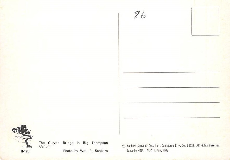 The Curved Bridge, Big Thompson Canon Postcard Grade: 1 Size: Continental Size - approximatly 4 Inch x 6 Inch (15 cm x 10.5) Grading Scale: Grade 1 = Perfect corners Grade 2 = Very Minimal corner wear, no crea ... Read More