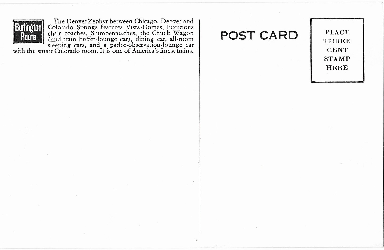 Denver Zepher Train, Vista-Dome Cars, Parlor Observation car, one of America's finest Trains. Slight wear bottom Right cornerSeller Information