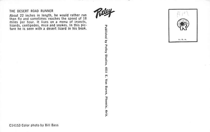 The Desert Road Runner Postcard View Images, Grade: 1, , Size: Regular Size Postcard - approximately 3 1/2 inch x 5 1/2 inch (9 CM x 14 CM) Grading Scale: Grade 1 = Perfect corners Grade 2 = Very Minimal corner ... Read More