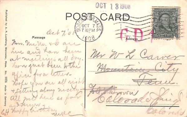 The First Baptist Church in Worcester, Massachusetts Postcard - 1908 Grade: 4 paper tear bottom edge Size: R - Regular size: Approx 3 1/2 X 5 1/2 inch (9 cm X 14 cm) Grading Scale: Grade 1 = Perfect corners Gr ... Read More