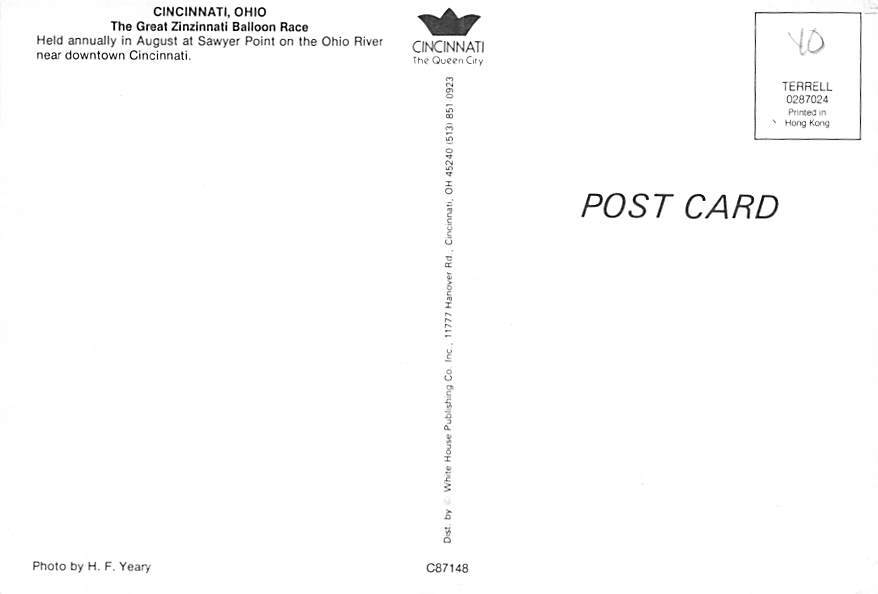 The Great Ballon Race, Cincinnati, Ohio Postcard Grade: 1 Size: Continental Size - approximatly 4 Inch x 6 Inch (15 cm x 10.5) Grading Scale: Grade 1 = Perfect corners Grade 2 = Very Minimal corner wear, no cr ... Read More