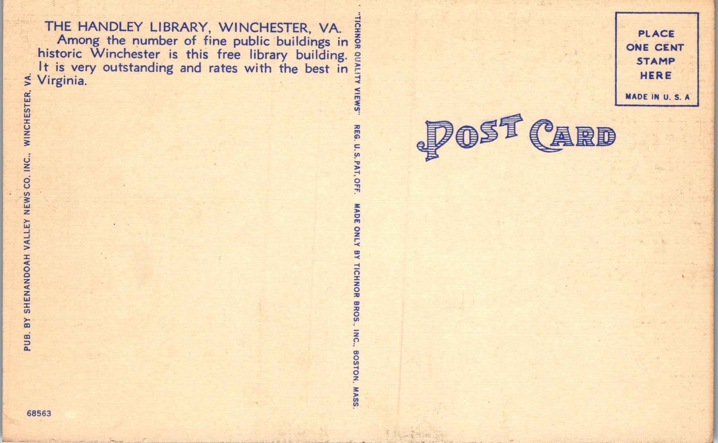 The Handley Library, Winchester, Va. Moonlight Card, Linen Unposted., Tichnor Bros.Seller Information
