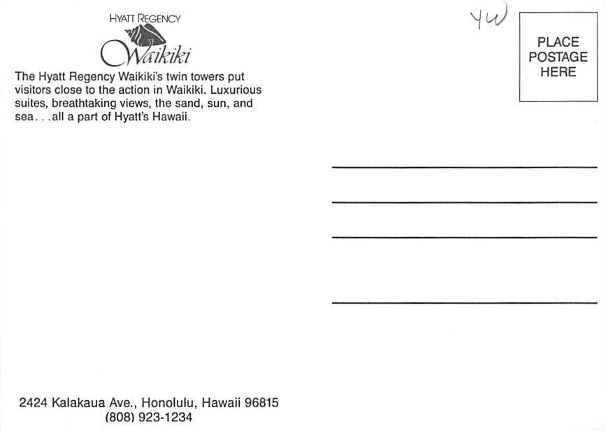 The Hyatt Regency Hotel, Honolulu, Hawaii Postcard Grade: 1 Size: Continental Size - approximatly 4 Inch x 6 Inch (15 cm x 10.5) Grading Scale: Grade 1 = Perfect corners Grade 2 = Very Minimal corner wear, no ... Read More