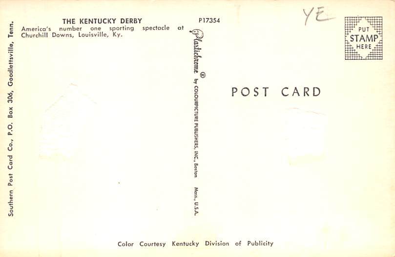 The Kentucky Derby Churchill Downs Louisville, Kentucky USA Postcard - View Images Grade: 1 Size: R - Regular Size Postcard - approximately 3 1/2 inch x 5 1/2 inch (9 CM x 14 CM) Grading Scale: Grade 1 = Perfec ... Read More
