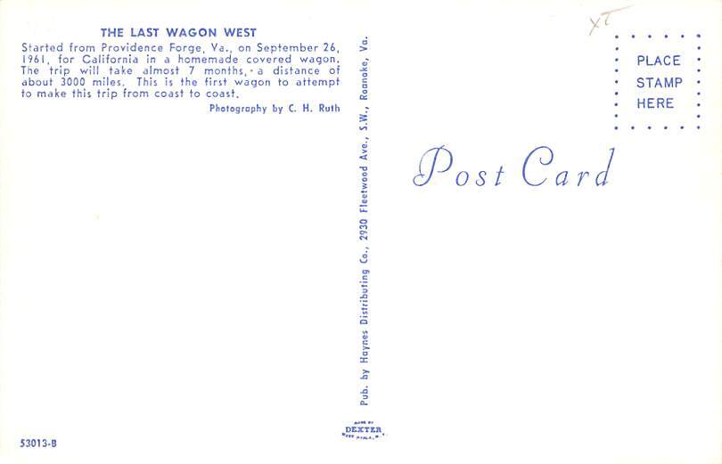The last wagon West Stagecoach Postcard Unused, Grade: 1 Size: Regular Size Postcard - approximately 3 1/2 inch x 5 1/2 inch (9 CM x 14 CM) Grading Scale: Grade 1 = Perfect corners Grade 2 = Very Minimal corner ... Read More
