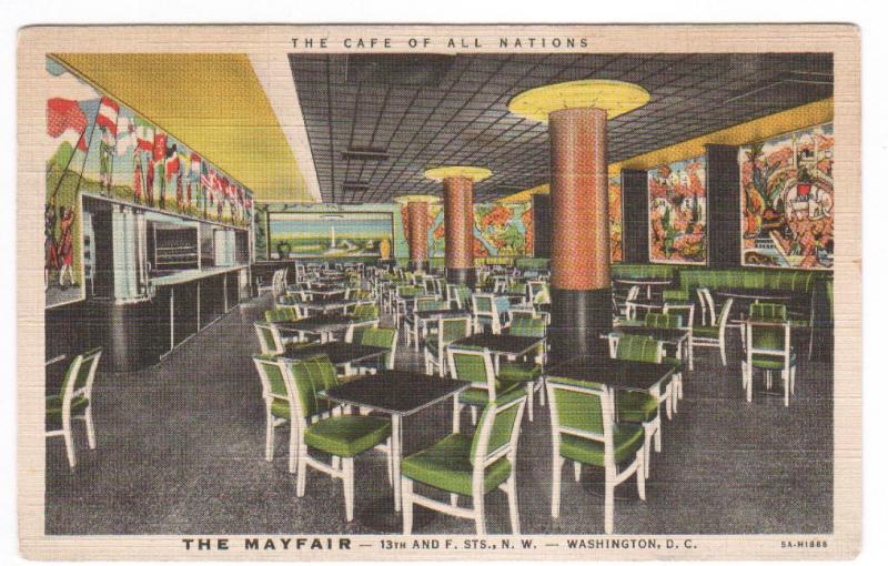 Description: The Mayfair Café Interior Washington DC linen postcardType: linen postcard. Circa 1940s, 50s