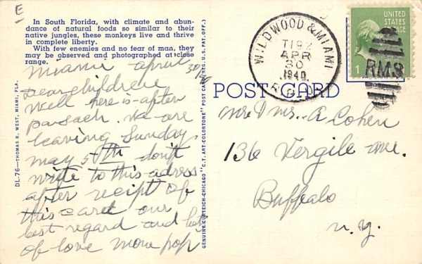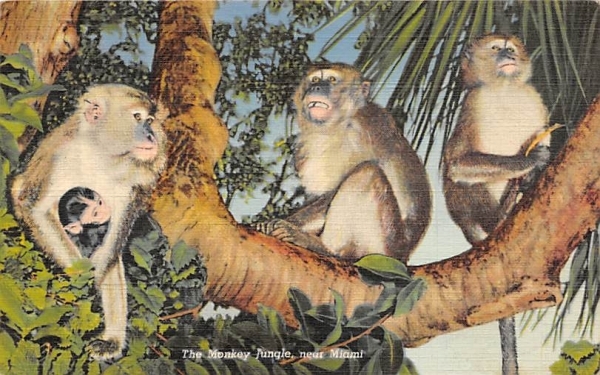 The Monkey Jungle Miami, Florida Postcard , Grade: 2 Size: Regular Size Postcard - approximately 3 1/2 inch x 5 1/2 inch (9 CM x 14 CM) Grading Scale: Grade 1 = Perfect corners Grade 2 = Very Minimal corner wea ... Read More