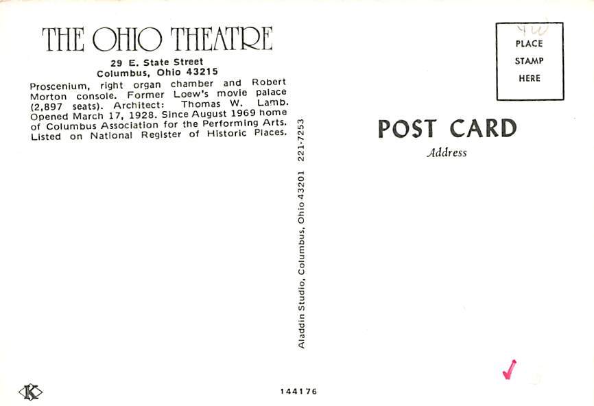 The Ohio Theatre , Columbus, Ohio Postcard Grade: 1 Size: Continental Size - approximatly 4 Inch x 6 Inch (15 cm x 10.5) Grading Scale: Grade 1 = Perfect corners Grade 2 = Very Minimal corner wear, no creases ... Read More