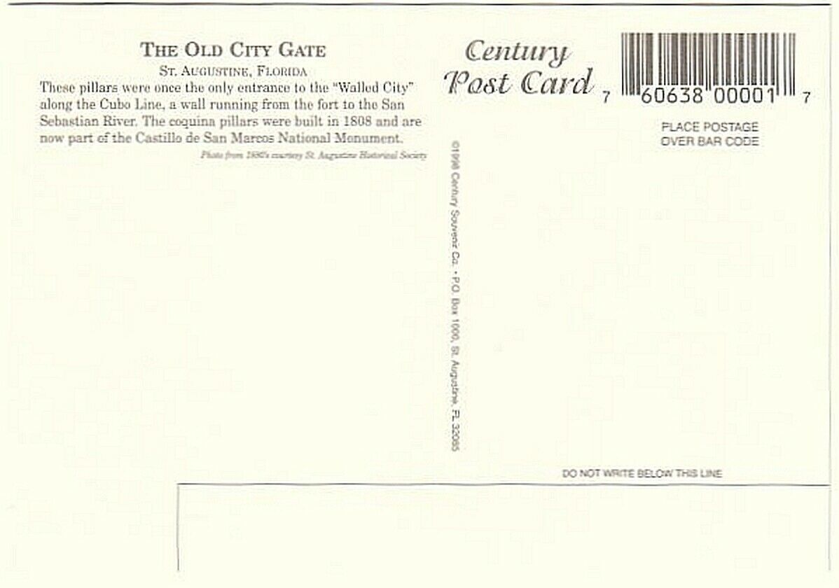 The Old City Gate, Circa 1886, St Augustine, Florida, 1996 Chrome Postcard